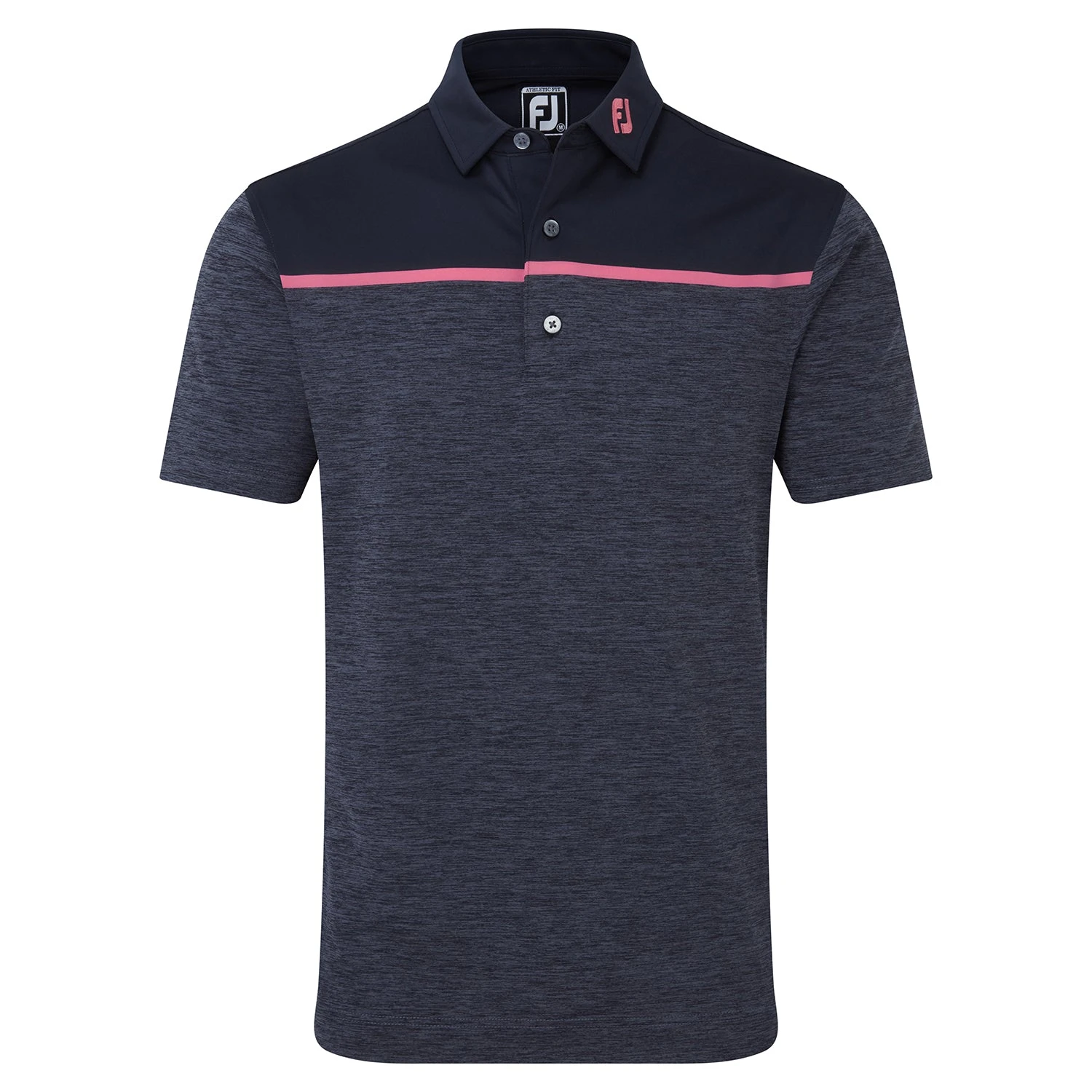 The Footjoy Space Dye Lisle Golf Polo Shirt is an attractive polo that will give you an athletic look both on and off the golf course. The stylish colour block design contrasts perfectly against the space dye body. Practicality is achieved through the lightweight stretch fabric to allow for full range of movement. It is also moisture wicking to always keep you dry and comfortable.
